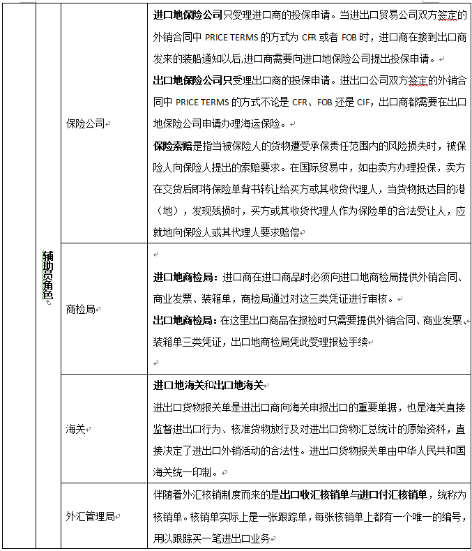 出口商、进口商、生产商(工厂)、进口银行、出口银行、保险公司、商检局、海关、外汇管理局、货代、国税局
