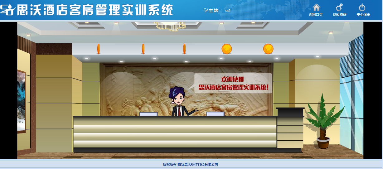 思沃酒店客房管理模拟实训系统以flash动画模拟酒店情景,学生进入进行模拟客房管理日常事务处理,包括客房设计、引领入住、客房查房、客房整理、布草间等类型实训。